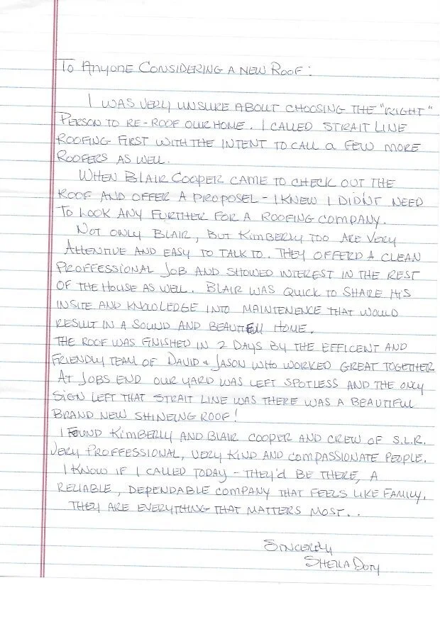 "I absolutely love Strait Line Roofing. They were so professional, fair in price and kept to their estimate that my husband and I were given. I highly recommend them to anyone who is in need of roofing work done. Thank you for such a fantastic job! We are so happy!"